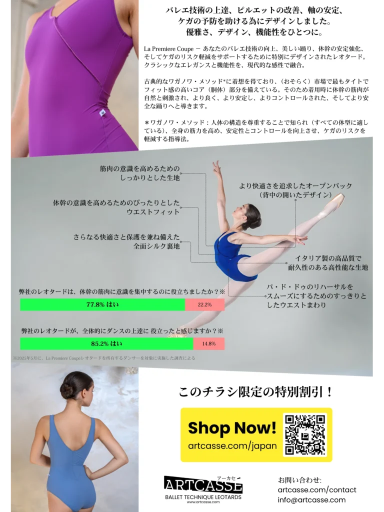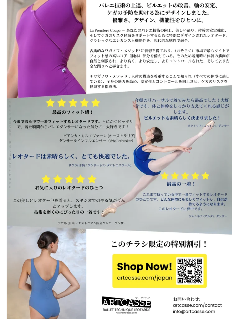 プレミアム品質のバレエレオタード。バレエの技術向上を目的に特別にデザインされ、安全性・快適性・スタイルすべてを兼ね備えています。